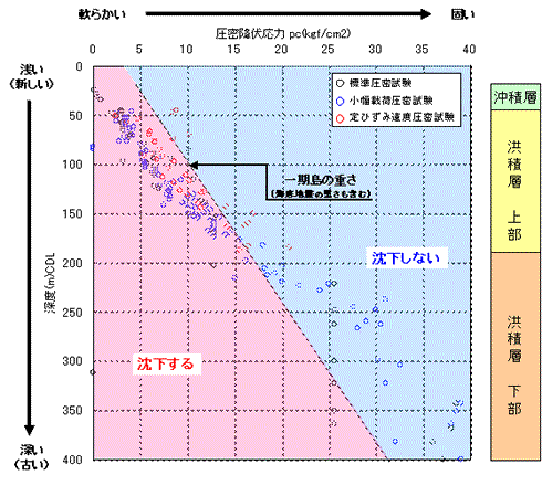 粘土は、何十万年というオーダーの長い時間、地中にあると、セメントのように徐々に固くなります。洪積層は古くて、かなり固くなっているため、従来のように海岸沿いを埋め立てたぐらいの重さでは、たいして沈下しません。しかし、空港島は水深の深い沖合を埋め立てたために埋立土砂も多く必要で重く、ある程度の深さまでの洪積層では、上から載った島の重さが粘土の固さを越えてしまい、沈下が生じるであろうことが、すでに事前の調査段階から想定されていました。詳しくは、『空港島の重さと沈下』のグラフをご覧下さい。